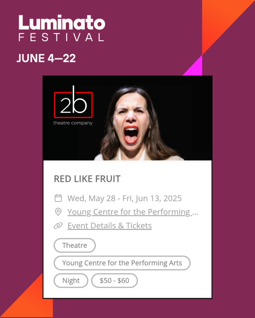 Red Like Fruit played at the prestigious Luminato Festival in Toronto as part of the Soulpepper Theatre season from May 28th to June 15th.